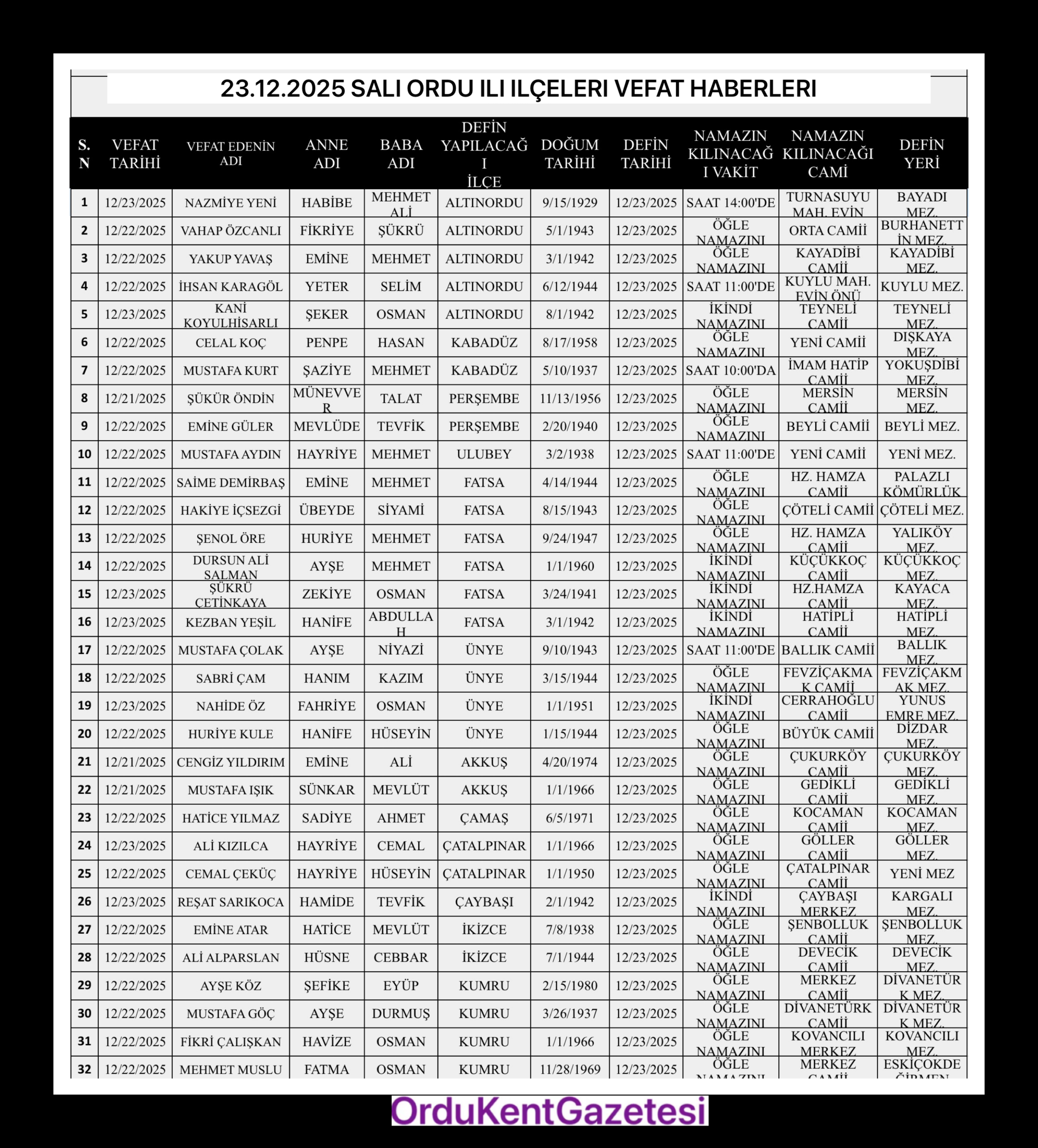 23.12.2025 SALI ORDU ILI ILÇELERI VEFAT HABERLERI
